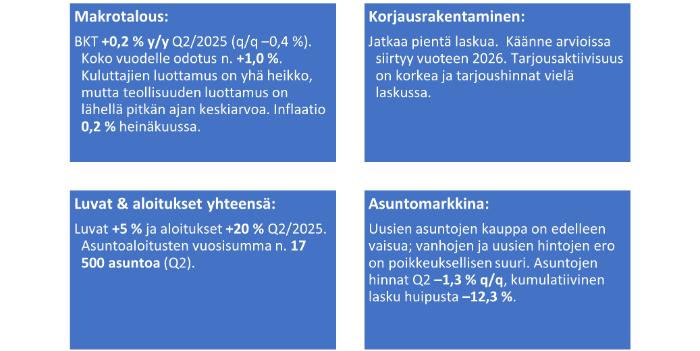 Aloitukset nousivat arviolta noin viidenneksen ja luvat maltillisesti. Vetureina toimivat opetuksen ja liikenteen hankkeet sekä teollisuus-/varastorakennukset, joissa suunta on vuoden alkupuolen perusteella selvästi ylös. Asuntorakentaminen jäi selvästi jälkeen: kerrostalojen aloitukset heikkenivät ja lupia kertyi niukasti. Kokonaiskuva on “varovainen käänne ylös”, joka ei vielä kanna laajasti asuntopuolelle.